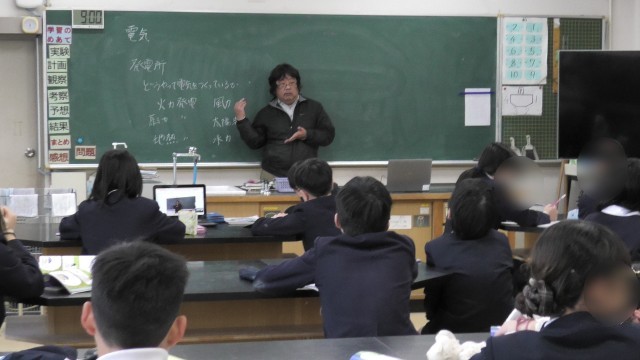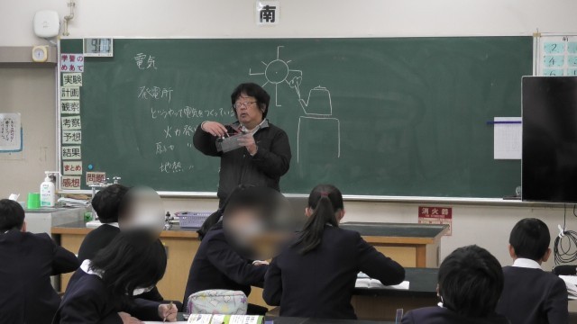 6年生が理科室で授業を受けています。授業をしているのは教頭先生です。引き回し発電機というものに興味を持ち、これから新しい単元に入っていく導入の授業です。