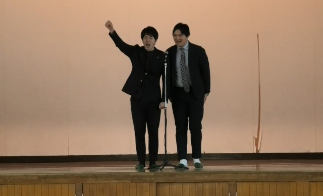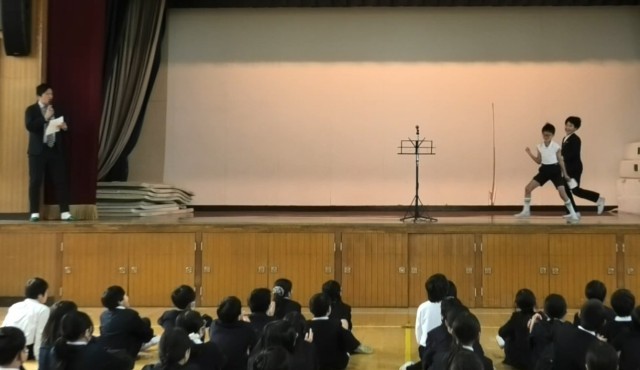 吉本の芸人さんが来校し、5年生たちに漫才を教えてくれました。実際に、どのクラスも2人組になって、漫才のネタを練習して教室で披露しました。その中から学級代表のコンビが2組ずつ講堂の舞台で漫才をやりました。どのコンビも面白かったと審査員さんから褒められていました。その後、