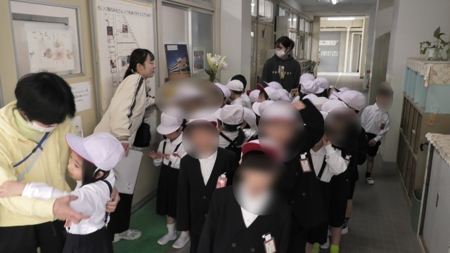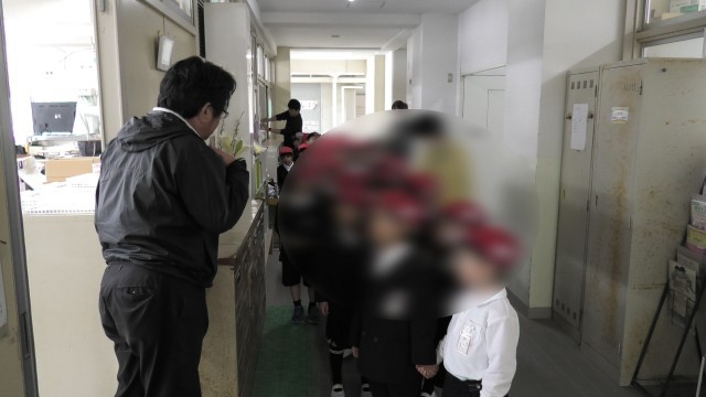 1年生がコンコンと校長室をノックしてきたので、扉を開けて校長室の中を見てもらいました。歴代校長の写真がずらっとならんでいるところなど、他の部屋との違いを見つけていました。みんな行儀よく静かでした。職員室の中に入るときは、礼儀正しく「失礼します」、声をかけ「1年〇組のだれそれ(名前)です。 ○○室のカギを取りに来ました。」というように入るんだよと教頭先生から教わっていました。学校にあるものの名前やいろいろな仕組みなど、覚えることはたくさんありますが、子どもはすごく柔軟であっという間に覚えてしまいます。今年の1年生は、人の話を聞ける子が多いなと思いました。
