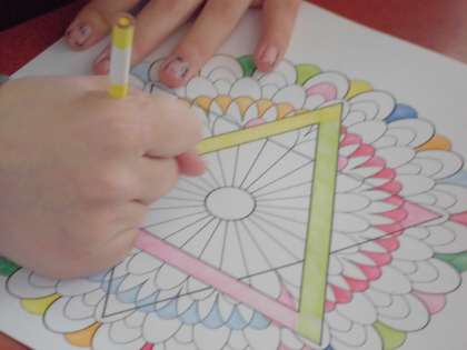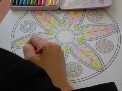 6年生の子どもたちが幾何学模様のようなデザインの花の絵を色えんぴつでぬっていました。さすが6年生です。はみ出さないのはもちろんですが、むらなくていねいにぬっていました。薄くしたり濃くしたり…上手ですね。