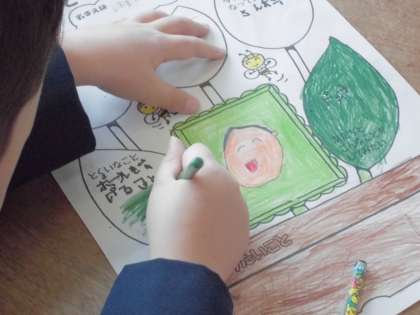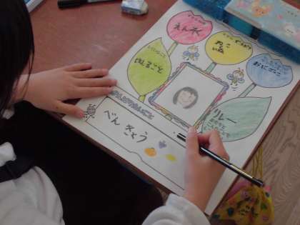 2年生の子どもたちが「じこしょうかいカード」を作っていました。真ん中に自分のかおをかいて、まわりに自分のすきなことやとくいなことをかいていました。みんなしっかりとした文字でかいていたのですごいなと思いました。はやくみんなとなかよくなれるといいな。