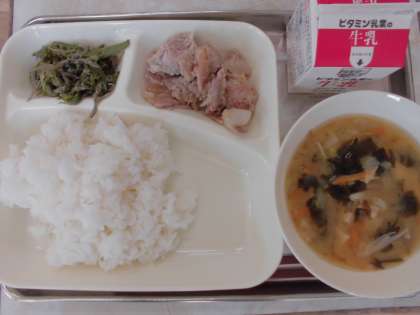 今日の給食のメニューは、豚肉のおろしじょうゆかけ、みそ汁、じゃこピーマン、牛乳、ごはん、でした。おろしじょうゆが豚肉の旨みを引き出していて、みそ汁もやさしい味でした。じゃこのおかげでピーマンも大好きになりました。1年生の子どもたちははじめての小学校での給食です。はじめてなのでしばらくは前を向いて食べます。なれてきたらみんなで班になって楽しくたべようね。子どもたちは上手にはしをつかいながら、おいしそうに食べていました。しっかり食べておおきくなあれ!(*^▽^*)