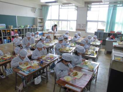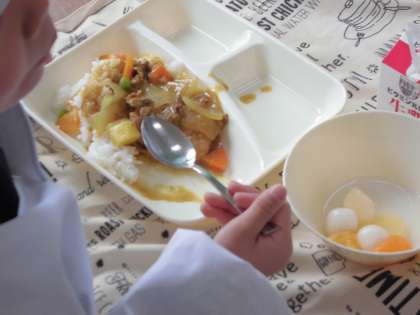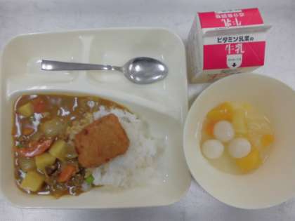今日の給食のメニューは、カツカレーライス、フルーツ白玉、牛乳、でした。カレーライスは食べやすい大きさに牛肉や野菜がカットされていて、ルウもまろやかに仕上がっていました。一口トンカツは肉厚でころもがサクッと揚げられていました。白玉ももっちもちです。ご家庭のカレーもおいしいですが、給食のカレーも子どもたちには大人気。実は今日のメニューは1年生のための「入学お祝い献立」なんです。1年生の子どもたちも「おいしい おいしい」と言って食べていましたよ。(^_-)-☆