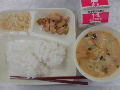 今日の給食のメニューは、焼きとり、みそ汁、もやしのゆずの香和え、牛乳、ごはん、でした。焼きとりは甘めのタレが香りよく焼かれた鶏肉と白ネギにからんでおいしかったです。みそ汁はだしがしっかりととられていて、野菜も細かく刻まれていました。もやしのゆずの香和えはさっぱりとした仕上がりで、ほのかにゆずの香りがしました。