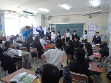 毎週火曜日にはネイティブティーチャーのケビン先生が来てくれています。英語の時間は子どもたちが楽しみにしている時間でもあります。6年生の子どもたちがケビン先生と一緒にチャンツ(歌や簡単な動き)をして交流を深めていました。今日は1月から12月までを英語でリズムにのせて歌います。誰が大きな声で歌えるかな?…、順番に前に出てチャレンジ。担任の先生も授業を盛り上げていました。