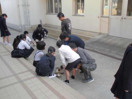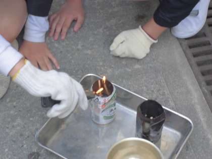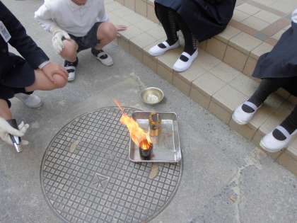 何やらにおいがするなぁと思ったら、6年生が体育館横で理科の実験をしていました。どうすれば、ものをよく燃やすことができるだろうか、燃やす工夫について調べていました。空き缶をつかっていました。普通の空き缶と下の方に穴があけられている空き缶、どちらの方がよく燃えるかな?そしてその理由は何だろうか?子どもたちは実験を通して空気の動き(通り道)が関係していることに気がつくことができました。