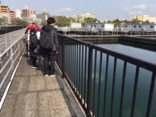 まずは施設の見学です。沈でん池のようすを見て回りました。池の底にたまった沈でん物はしずかにかきよせられて、排水処理施設まで運ばれます。子どもたちは興味関心をもってのぞき込んでいました。「この水が本当にのめるくらいにきれいになるのかな?」「すごいなぁ。」…、子どもたちのつぶやきが聞こえてきます。