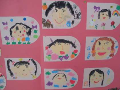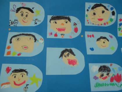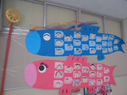 正面玄関入ってすぐのところに大きな「こいのぼり」が掲示してありました。青色と赤色の大きなこいのぼりです。1年生の子どもたちの作品です。うろこの部分一枚一枚が子どもたちが描いた一人一人の似顔絵になっていて、まるで大きなこいの背中に1年生子どもたちが乗って優雅に大空を泳いでいるように見えました。