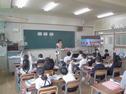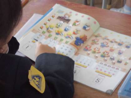 1年生が算数の授業で「かず」について勉強していました。絵を見ながら、「タンバリンは2つです。」「カエルは4ひきです。」「チューリップは3つです。」・・・、かずと同じものを絵の中からさがしていきます。「はい はい はい はいっ!」・・・、子どもたちはせんせいにあててほしくて大きな声で元気よく返事をしながら手を何回もあげていました。