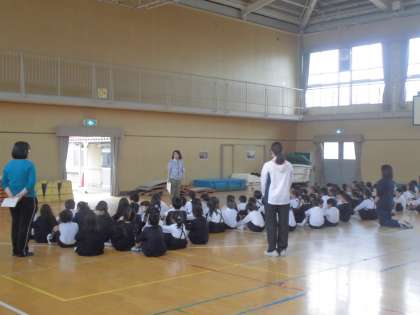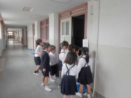 2年生の子どもたちが先日から計画、準備をしていた「がっこうたんけん」を行いました。どこに案内するのか、どんなふうに説明するのか、質問にはどう答えるのか、…2年生の子どもたちは朝から大はりきりです。はじめに講堂で1年生と2年生のグループになりました。先生からは今日の「がっこうたんけん」に向けてのめあてや注意することなどのお話がありました。さあ、出発です。