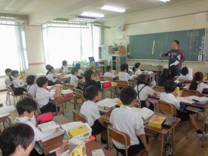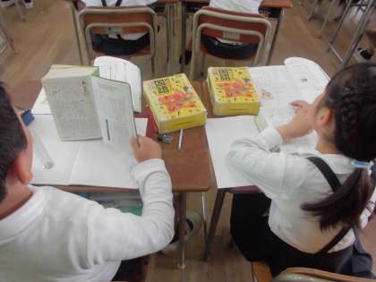 3年生が国語の授業で、国語じてんの使い方について勉強していました。国語じてんは言葉の意味や漢字を使った書き表し方、言葉の使い方などを調べることができます。言葉が五十音順にならんでいて、1文字目が同じときは2文字目、2文字目も同じときには3文字目を見ていきます。子どもたちはそのことをページをめくりながら確認していました。