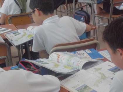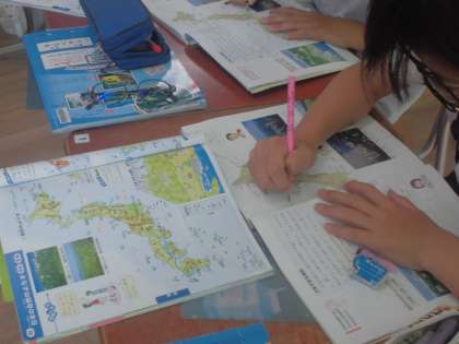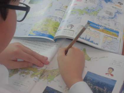子どもたちは地図帳をのぞきこんで、「あった ○○山脈」「○○平野 見つけたよ」…などと声をあげながら日本の国土について確認していました。