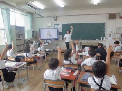 1年生の子どもたちが元気よく大きな声で国語の教科書を音読をしていました。一人で読んだりみんなで読んだり…、じょうずです。挿絵を見ながら、「どんなばめんかな?」「どんなきもちかな?」と先生がたずねると、子どもたちはさっと手をあげて「○○しているところです。」「○○なきもちです。」と元気よく答えていました。
