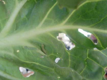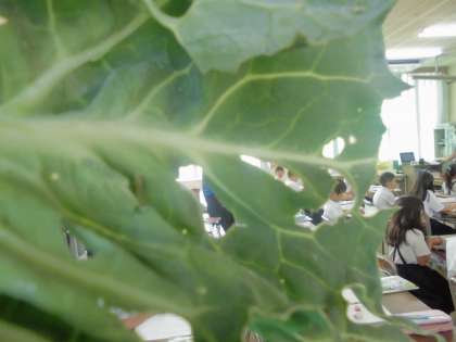 3年生の教室のくつばこの上にキャベツが入ったケースが置いてありました。さがしてみたら、いたいた、あおむしが・・・。モンシロチョウの幼虫です。学習園からとってきたのかな?まだまだ小さいです。写真では少しわかりにくいかもしれませんが、確かにいました。見つけられますか?子どもたちが「キャベツにいっぱいあながあいているのは、あおむしが食べたから」と教えてくれました。