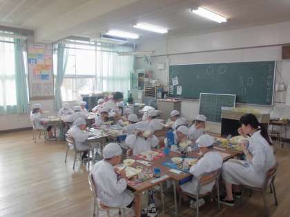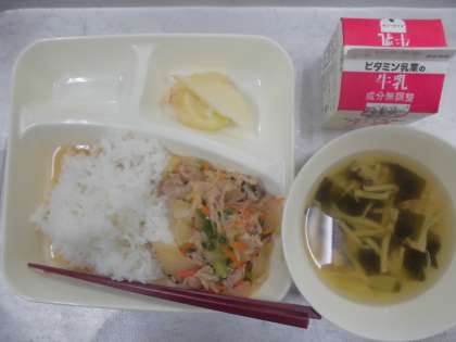 今日の給食のメニューは、豚丼、湯葉のすまし汁、焼きじゃが、牛乳、でした。豚丼は豚肉は料理酒で下味がつけられていて、甘めの和風だしが具材にもしっかりとしみ込んでいました。糸こんにゃくが食感にアクセントを与えていました。湯葉のすまし汁はだしが十分にとられていて、味に深みが感じられました。湯葉やたけのこが入っていたので少し高級感を味わえました。焼きじゃがはやわらかく型崩れしないように上手に焼かれていました。