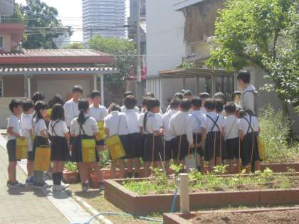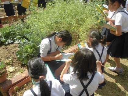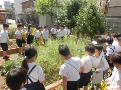 3年生が学習園でアブラナの観察をしていました。「アブラナってあぶらがとれるんだよね?」とある子が先生にたずねていました。しっかりと形や色を観察しながら、みんながんばってスケッチをしていました。