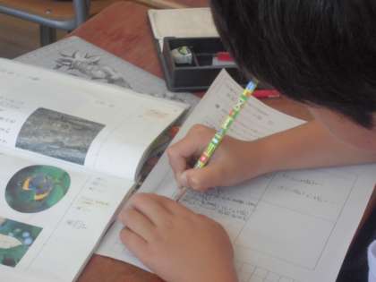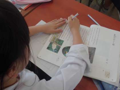 3年生が国語の授業で説明文の学習をしていました。「自然のかくし絵」という説明文です。昆虫の中には保護色によって敵から身を守るために自然にとけこんで見えなくなってしまうようなものもいます。たとえば・・・といくつかの昆虫が紹介されていました。子どもたちは文章を読み取りながら線を引いたり、質問やその答え、説明などに分類してプリントにまとめたりしていました。身近な生き物たちなので、子どもたちもとても興味を持っているようすでした。
