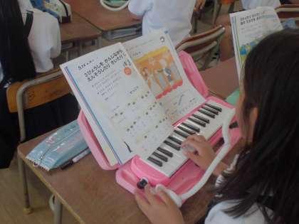 2年生の教室からけんばんハーモニカの音が聞こえてきました。「かえるのがっしょう」や「かっこう」の練習をしていました。子どもたちが吹き口をくわえてほっぺたをふくらましながらいっしょうけんめいに吹いているようすがとてもかわいらしかったです。