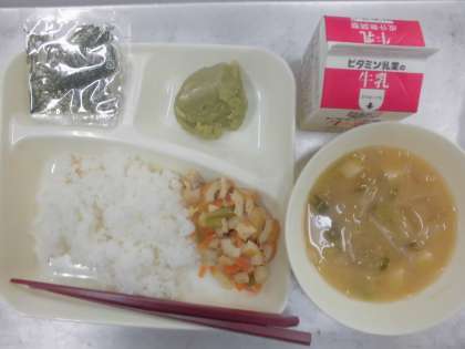 今日の給食のメニューは、かやくご飯、みそ汁、抹茶ういろう、牛乳、でした。かやくご飯は細かく刻まれた鶏肉、ちくわ、にんじん、三度豆がだしとしょうゆをベースに甘めに味つけられていて、ごはんに混ぜるととてもおいしかったです。みそ汁は野菜中心でやさしい味でした。抹茶ういろうは抹茶の香りが効いてもっちりしていました。抹茶はお茶の葉を石うすで細かく粉状にしたものを言います。和菓子や洋菓子、料理の材料などとしてよく使われます。