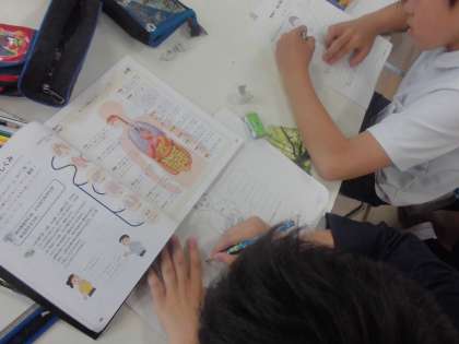 6年生が理科の授業で調べ学習をしていました。ヒトの体の中には肺や心臓、かん臓やじん臓、小腸や大腸などがあります。臓器はたがいに血液を通してつながり合ってはたらいています。どんなつながりやはたらきがあるのでしょうか。子どもたちは自分で教科書を見ながら調べたことをプリントに書いてまとめていました。