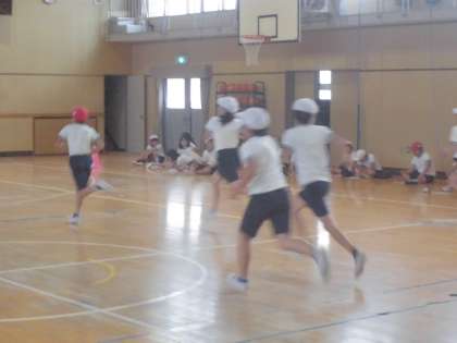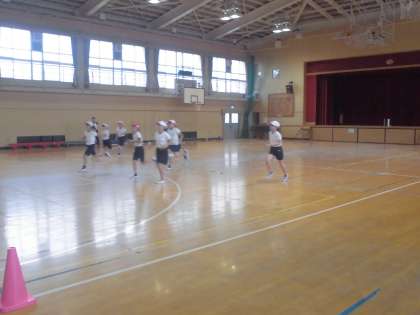 5年生が体育館でシャトルランをしていました。子どもたちの「はーはー」という息が聞こえてきます。子どもたちは少しでも記録を伸ばそうとがんばっていました。