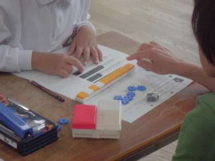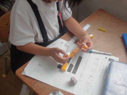 子どもたちはブロックやおはじきなどの具体物を使いながら、ていねいに確認していました。「せんせい できたよー みてー」