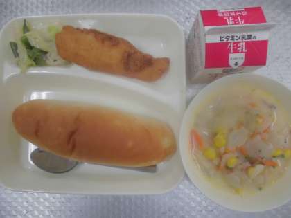 今日の給食のメニューは、サーモンフライ、キャベツと三度豆のサラダ、牛乳、パン、でした。サーモンフライはころもはサクサクでサーモンの身はふっくらやわらかく揚げられていました。豆乳スープはとてもやさしい味にととのえられていて、ベーコンの塩気やコーンの甘みがアクセントになっていました。キャベツと三度豆のサラダはさっぱりとした口当たりでした。