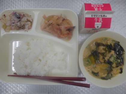 今日の給食のメニューは、鶏肉の甘辛焼き、みそ汁、キャベツの赤じそ和え、牛乳、ごはん、でした。鶏肉の甘辛焼きは焼き鳥のたれのような味付けで、焦げ目もあり香ばしさも感じられました。みそ汁はだしがしっかりととられていて、オクラが入っていたので少しとろみ感がありました。ほかにもうすあげ、かぼちゃ、わかめが入っていました。キャベツの赤じそ和えは赤じその風味がしっかりと効いていました。