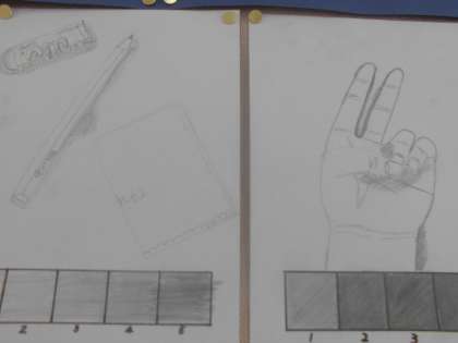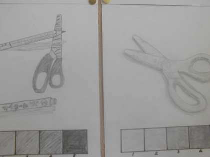 6年生が鉛筆の濃淡を意識して描いた図工の作品(デッサン)が掲示してありました。なかなかリアルに描けていましたよ。さすが6年生ですね。