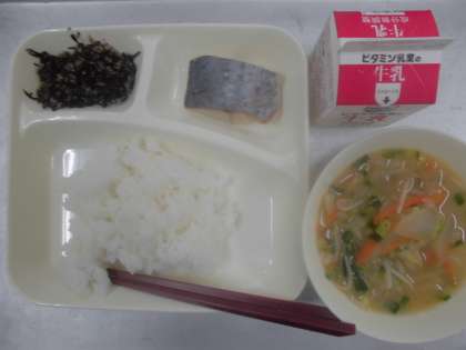 今日の給食のメニューは、さごしの塩焼き、みそ汁、牛ひじきそぼろ、牛乳、ごはん、でした。さごしの塩焼きは身はふっくらとしていてほぐしやすく、骨もなかったので食べやすかったです。みそ汁は野菜中心の具で、やさしい味に仕上がっていました。牛ひじきそぼろは牛挽肉とひじきが少し甘めの味にととのえられていて、ごはんと一緒に食べるとちょうどよかったです。