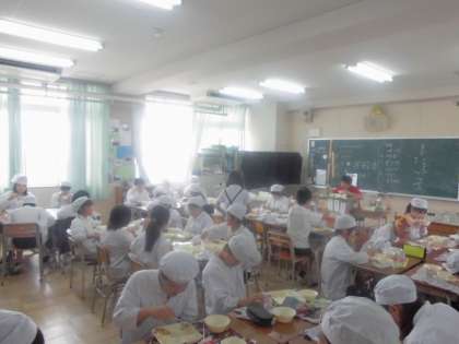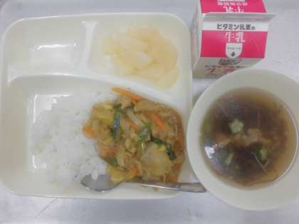 今日の給食のメニューは、和風カレー丼、もずくとオクラのとろり汁、和なし、牛乳、でした。和風カレー丼は和風だしがしっかりと効いていて、うすあげに和風カレーがしみ込んでいておいしかったです。豚肉の旨みも感じられました。もずくとオクラのとろり汁はすまし汁のような感じで飲みやすかったです。もずくには食物繊維がたっぷりふくまれています。和なし(缶づめ)はつめたく冷やされていました。