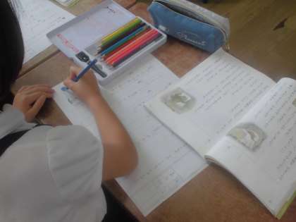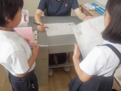 2年生が国語の授業で、「お手紙」という物語を学習していました。登場人物にはかえるくんが出てきます。子どもたちは文章を読みながら、かえるくんのしたことや動きについて、一つずつ確認しながらノートに書き写していきました。できたら先生に見てもらいます。「はい、あっていますよ」・・・先生から「はなまる」をもらって、子どもたちもうれしそうでした。