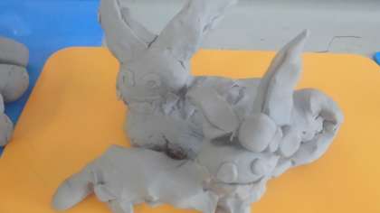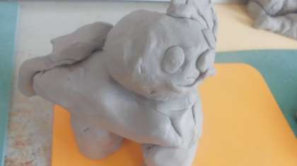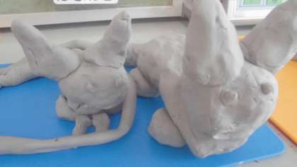 1年生の教室の後ろのロッカーの上に、ねんどあそびでつくった作品が置いてありました。いろいろな生き物がいました。なんだろう?なにに見えますか?