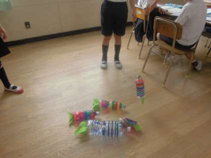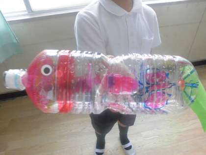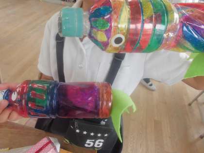 2年生がペットボトルでカラフルなさかなを作っていました。