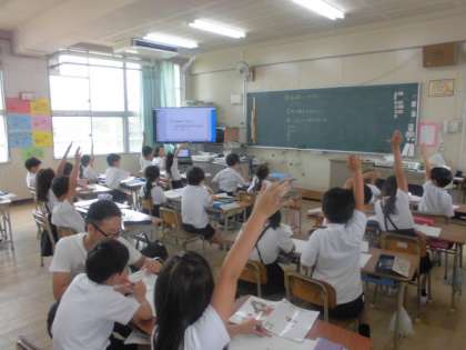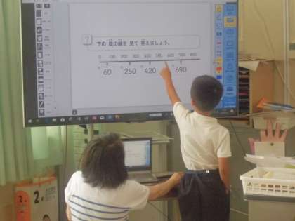 線の数をよむときは、いちばん小さい1めもりがいくつかを考えることが大切ですね。子どもたちは「できた!できた!」と元気よく手をあげていました。電子黒板でみんなで確認もしました。