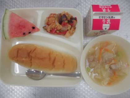 今日の給食のメニューは、鶏肉と夏野菜のソテー、押麦のスープ、すいか、牛乳、パン、でした。鶏肉と夏野菜のソテーは鶏肉、たまねぎ、トマト、なす、きゅうり、赤ピーマンがにんにくとオリーブ油で香りよくソテーされていました。押麦のスープはチキンスープをベースに塩こしょう、しょうゆで味がととのえられていて、具財もたくさん入っていました。すいかはみずみずしく甘くて、夏の到来を感じさせてくれました。