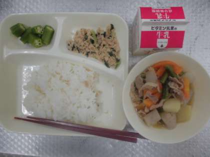 今日の給食のメニューは、豚肉とじゃがいもの煮物、オクラの甘酢和え、ツナっ葉炒め、牛乳、ごはん、でした。豚肉とじゃがいもの煮物はほんのり甘めの和風ベースの味つけで、じゃがいもにも味がしっかりとしみ込んでいました。豚肉の旨みも感じられ、こんにゃくの食感もアクセントになっていました。オクラの甘酢和えは薄めの味つけでした。オクラにはカロテン、ビタミンC、ビタミンB1、カルシウム、食物繊維が多く含まれているそうです。ツナっ葉炒めはツナと大根の葉が一緒に炒められていました。