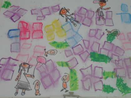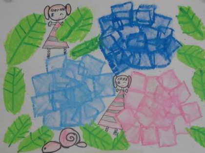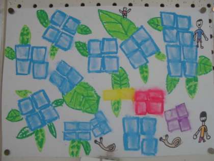 1年生が図画工作で描いた「あさがお」が教室の後ろに掲示してありました。どの子の作品も個性的で心が和みます。かたつむりや人がこっそり登場しているところがまたかわいいです。
