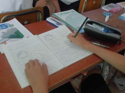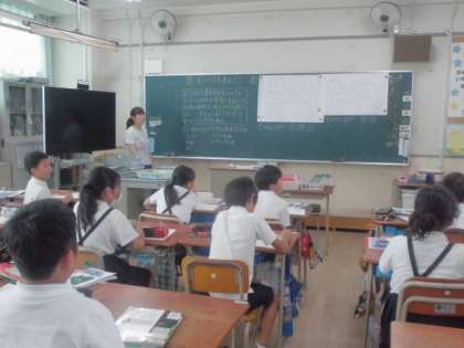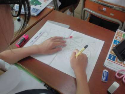 5年生が算数の授業で「合同な図形」について学習していました。「合同な図形」って何かわかるかな?・・・ぴったりと重ね合わすことのできる2つの図形は、合同であるといいます。合同な図形は、形も大きさも同じです。うら返すとぴったり重ね合わすことのできる図形も、合同であるといます。学習のはじめなので、まずは身の回りや持ち物、教室の中から合同な図形を探すことにしました。ノートは、お金は、時計は、窓は、トランプは、折り紙は、・・・。