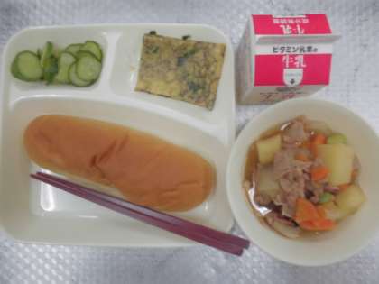 今日の給食のメニューは、もずく入りのヒラヤーチー、豚肉といかの煮物、あっさりきゅうり、牛乳、パン、でした。もずく入りのヒラヤーチーはもずくとにらが入っていて、醤油で味がつけられていました。ヒラヤーチーとは小麦粉、卵、水などをまぜ合わせて、いろいろな具材を加えた生地を平たくのばして焼いた料理です。ヒラヤーチーは沖縄県のことばで「平焼き」という意味だそうです。豚肉といかの煮物はだしがしっかりと効いた和風だしがベースになっていて、いかの風味が感じられました。あっさりきゅうりはきゅうりがみずみずしくシャキシャキしていました。