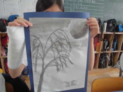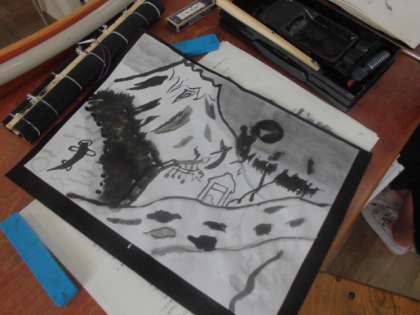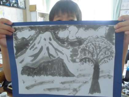 不安の中、墨に水を少しずつ加えながら、濃淡を意識して描いていきます。小筆の先を駆使しておそるおそる筆を進めていきます。うーん、なんとなくいい感じ…。「上手やん」「いいんちゃう」・・・お互いにほめ合う言葉がたくさん聞こえてきました。前向きな子どもたちです。(笑)(#^.^#)