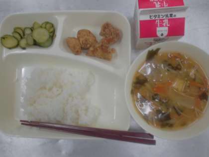 今日の給食のメニューは、鶏肉の香味揚げ、みそ汁、きゅうりの甘酢づけ、牛乳、ごはん、でした。鶏肉の香味揚げはしょうがの香りが効いていて、ころもはカリッと中はジューシーに揚げられていました。みそ汁は昆布とかつお節のだしがしっかりととられていて、具だくさんでした。きゅうりの甘酢づけはあっさりとした味に仕上がっていました。