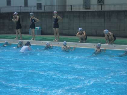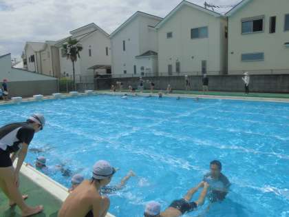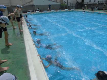 5年生が水泳指導で平泳ぎの練習をしていました。足の動かし方がポイントなのですが、先生の指導を受けて、何度も試していました。上からはペアの友だちが確認もしていました。平泳ぎが苦手という子も多いので、しっかりと練習を頑張ってほしいと思います。