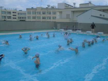1年生の子どもたちがプールに入っていました。もう大きなプールにも慣れっこです。水の中にもぐったり、友だちに手をもってもらって、ふし浮きのように浮いたりもしました。とにかく1年生は先生が「次は○○するよー」と言うだけで、「やったぁ やったぁ」と喜びます。