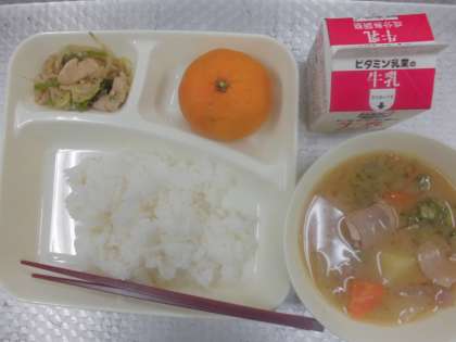今日の給食のメニューは、ピリ辛野菜炒め、オクラ豚汁、みかん、牛乳、ごはん、でした。ピリ辛野菜炒めは鶏肉、もやし、キャベツ、ピーマンをしょうゆとソース、一味で味付けしていますが、それほど辛くはなかったです。オクラ豚汁は豚肉の旨みとオクラのネバネバ感が合わさって、とてもおいしかったです。その他に、じゃがいも、にんじん、たまねぎ、こんにゃくなども入っていました。みかんは甘かったです。