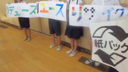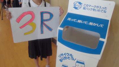 児童集会で美化委員会による発表がありました。3R(リデュース・リユース・リサイクル)についてわかりやすく紹介したり、リサイクル運動の取り組みを説明したりしていました。「これから牛乳やジュースなどの紙パックを集めます。」大きな紙パックの回収ボックスが紹介され、「ここに入れてください。」と大きな声で説明していました。どの子もはきはきとした言い方でとても立派な発表でした。