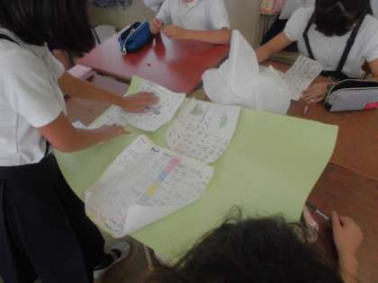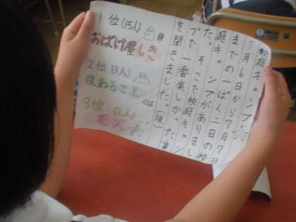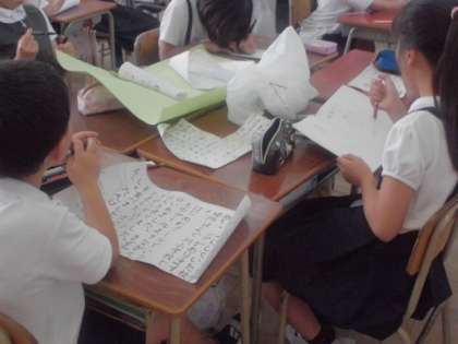 4年生の子どもたちが楽しかった校庭キャンプをテーマに新聞づくりをしていました。それぞれがアンケートや取材をしたり、楽しかったことや思い出に残ったことなどを記事にしたりして、大きな一枚の紙にはりつけていきます。作業よりも思い出話の方が盛り上がっているグループもありました。