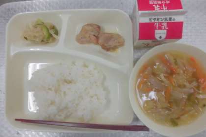 今日の給食のメニューは、鶏肉のしょうゆマヨネーズ焼き、五目汁、切干し大根のゆずの香和え、牛乳、ごはん、でした。鶏肉のしょうゆマヨネーズ焼きはしょうゆの香ばしさとマヨネーズのまろやかさが合わさり、また鶏肉は身はやわらかくとてもおいしく焼けていました。五目汁は深みのある味わいで、具材もていねいに細かく刻まれていました。切干し大根のゆずの香和えは米酢が効いていて、ゆずの香りとともにさっぱり感が感じられました。