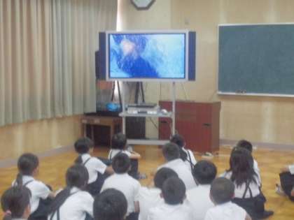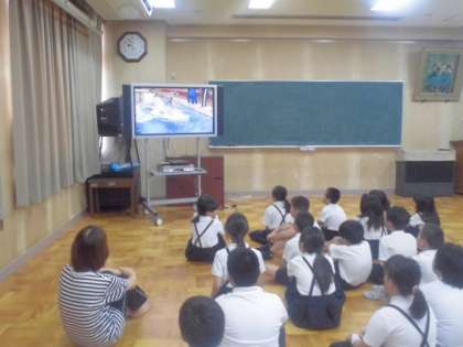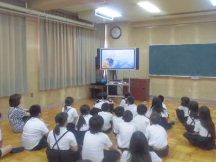4年生が着衣水泳を体験する前に、どうしてそのような体験をするのかについて学習していました。映像を見ながら、その意義について学んでいました。この後は、実際にプールで体験していきます。