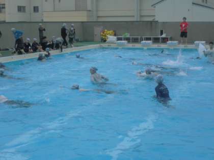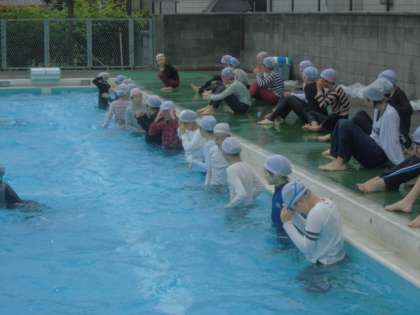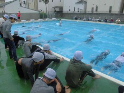 6年生がプールで着衣水泳を体験していました。もしも服を着たまま水の中に落ちたら、どれだけ泳ぎにくいか、動きにくいかを体験するためです。これから水の季節になってきます。家族で海や川へ遊びにいくこともあるかもしれませんね。自ら危険を察知し、安全に行動するためにも、着衣水泳を体験しておくことはとても貴重です。子どもたちは実際に体験して、「ものすごく泳ぎにくい。」「思うように動けない。」「息継ぎがむずかしい。」「体力がうばわれる。」「服がめっちゃ重くなる。」「脱ぎにくい。」・・・などのいろいろな感想をもつことができました。